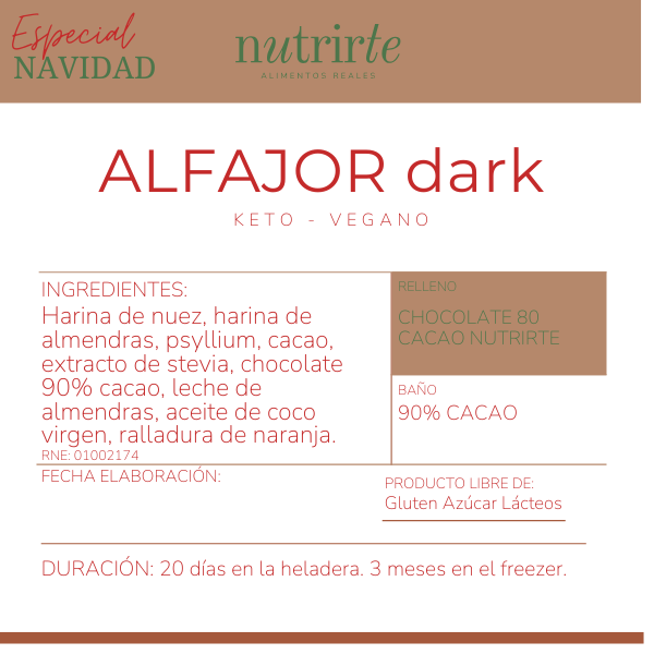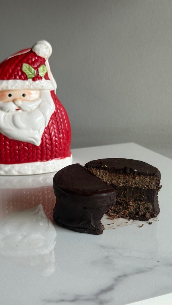 Ingredientes: Harina de nuez, harina de almendras, psyllium, cacao, extracto de stevia, chocolate 90 cacao, leche de almendras, aceite de coco virgen, ralladura de naranja.